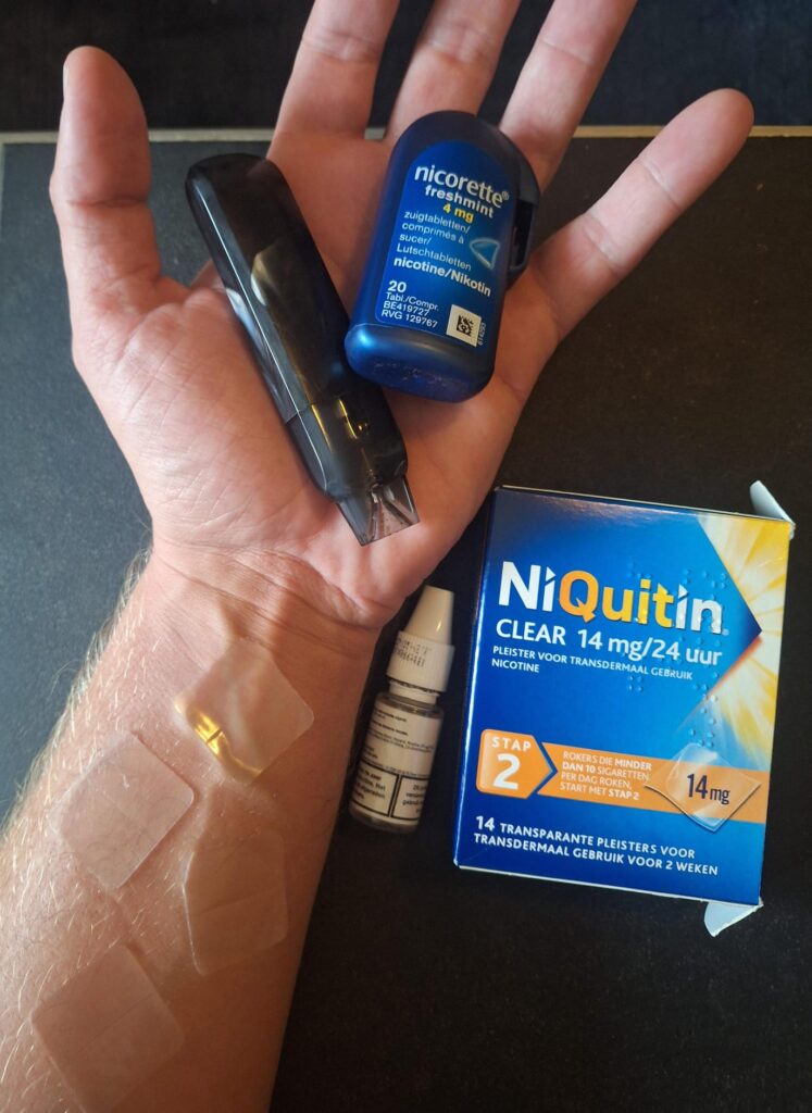 Tijdens het stoppen heb ik alles geprobeerd maar ben ik de sigaret vooral gaan vervangen met allerlei nicotine houdende middelen: vapes, snus, nicotinepleisters, zuigtabletjes, of een combinatie van dit alles. Ik heb vaker dan eens een nicotine pleister op gehad en begon dan tegelijkertijd weer met roken. Na die sigaret nam ik dan 1 of 2 nicotine zuigtabletjes, met mint smaak, om die vieze rooksmaak uit mijn bek te krijgen. Ook heb ik geprobeerd onder hypnose te stoppen maar voor mij werkte dit niet. Dit wijt ik overigens compleet aan de mindset die ik toen had. Ik dacht namelijk dat iemand met een paar zinnetjes mijn verslaving zou wegtoveren maar zo werkt hypnose blijkbaar niet. Helaas!